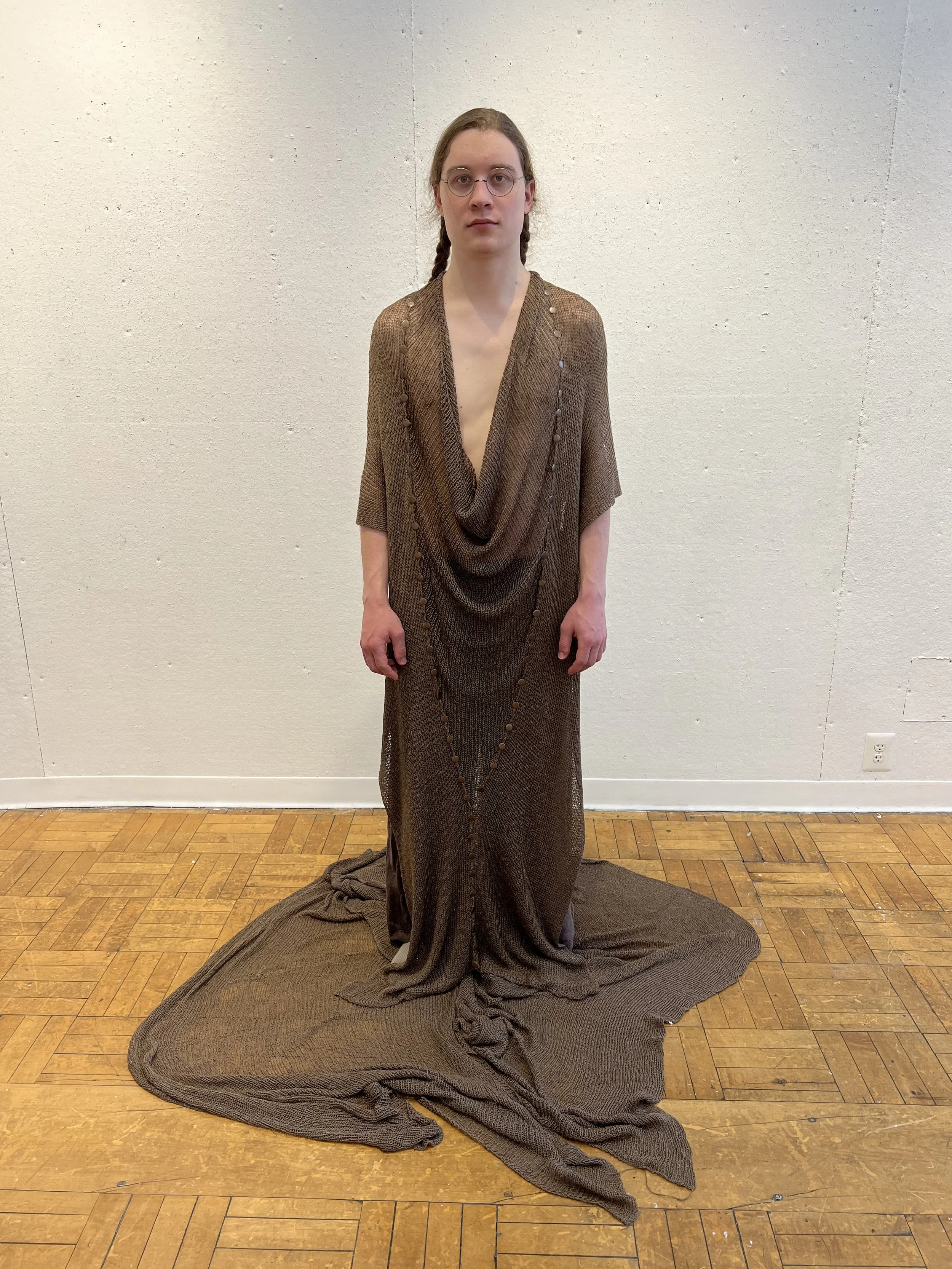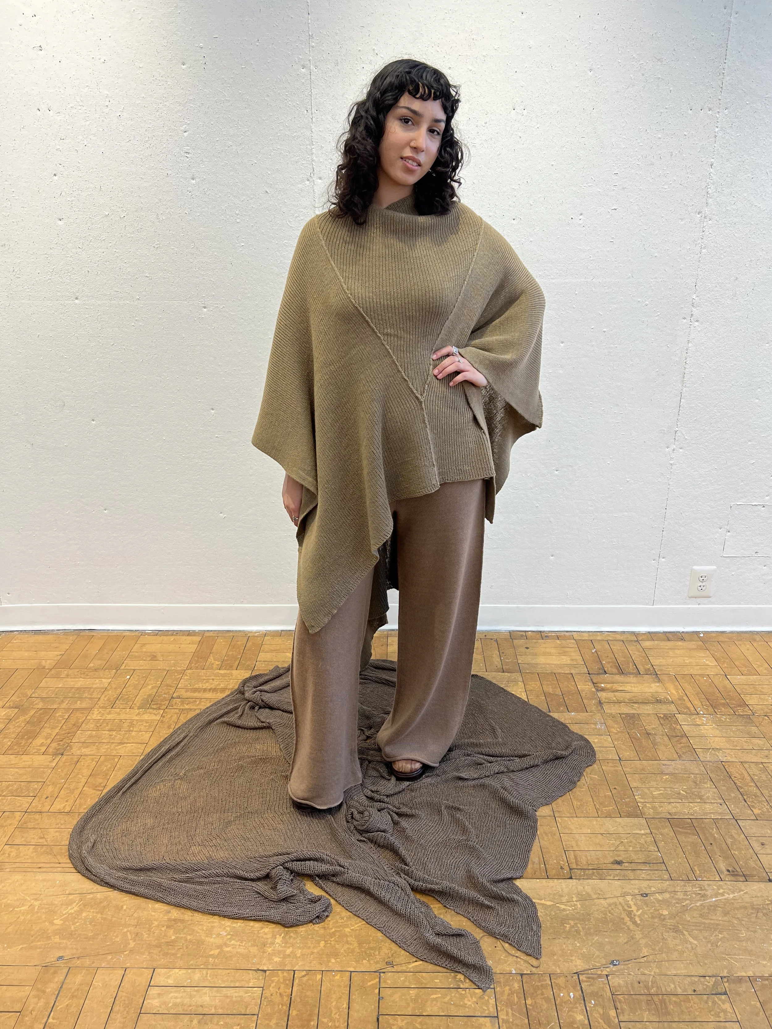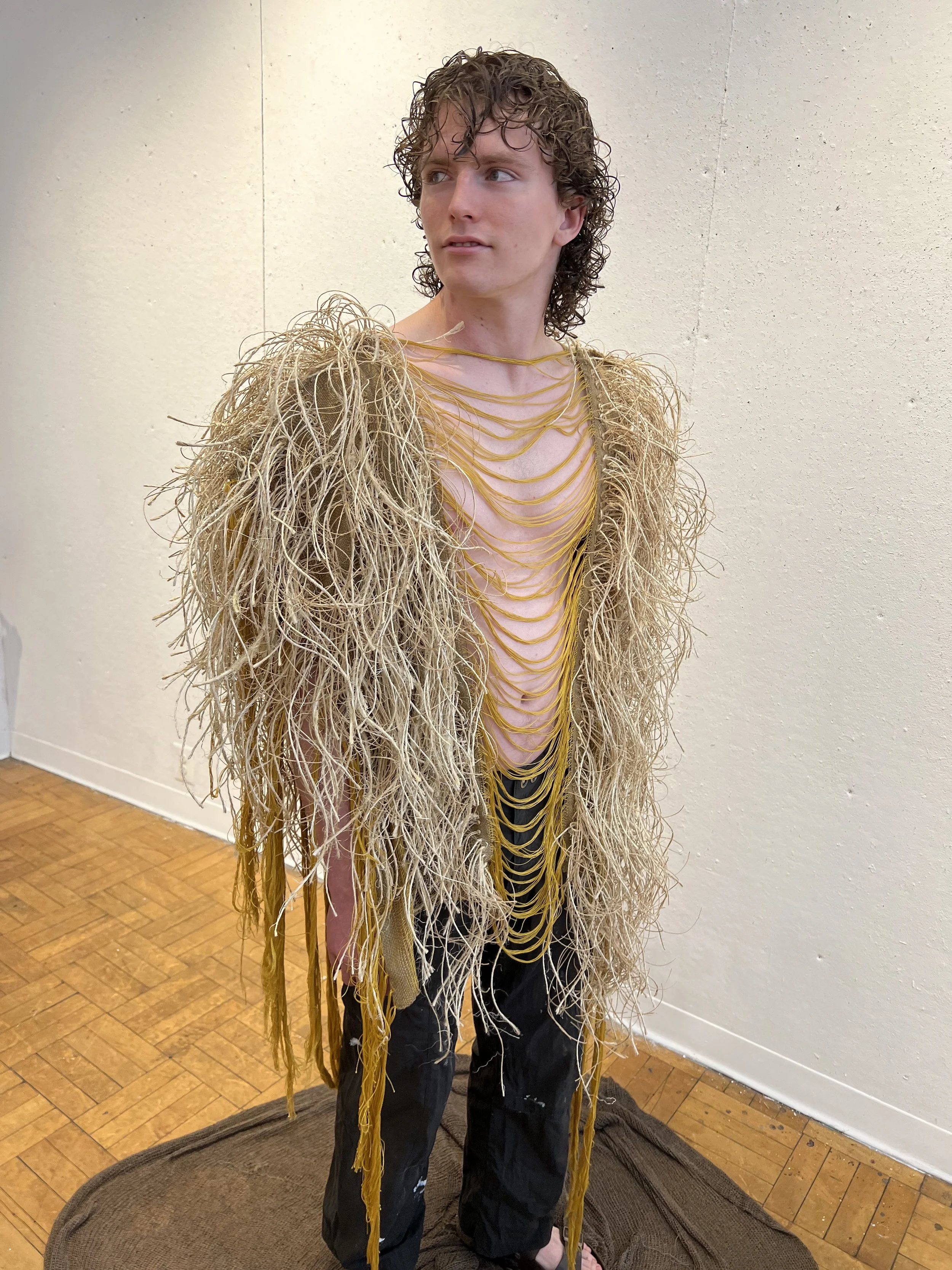 A preliminary body of work experimenting with simple, fully-fashioned constructions in machine knit rayons and wools, as well as woven jute tumbleweed assemblage.